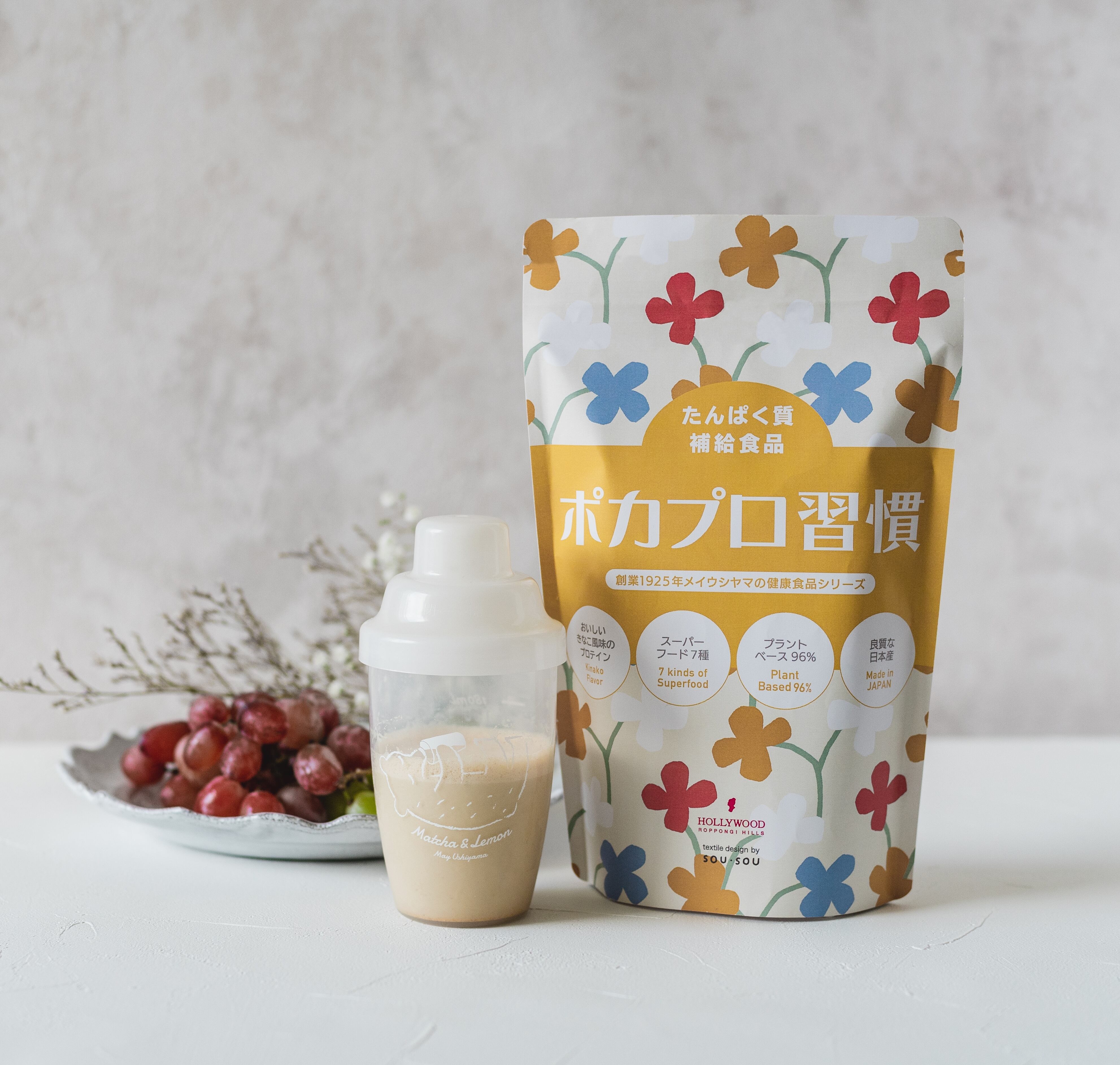 別売のシェーカーに水、または豆乳などを入れ、付属スプーン二杯分の「ポカプロ習慣」と混ぜるだけ。